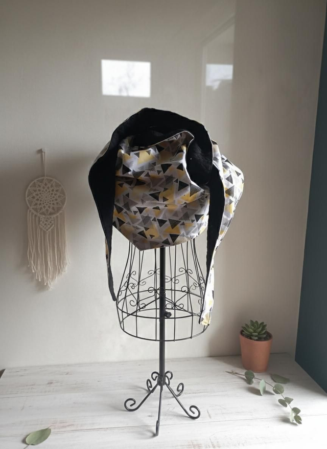 Réalisé avec un tissu en coton imprimé et un tissu en jersey torsadé.