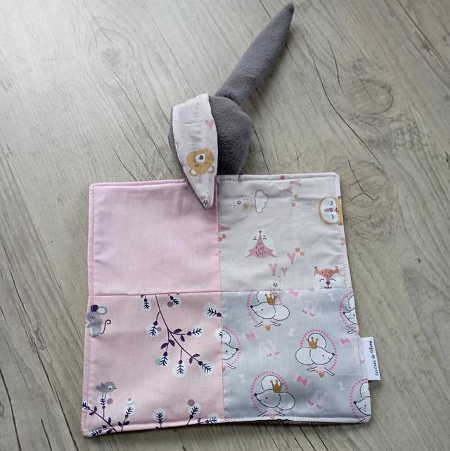 Doudou patchwork en tissu coton et tissu polaire également. Avec petite tête et 2 oreilles. Dimensions 23 x 23 cm ( sans la tête ).