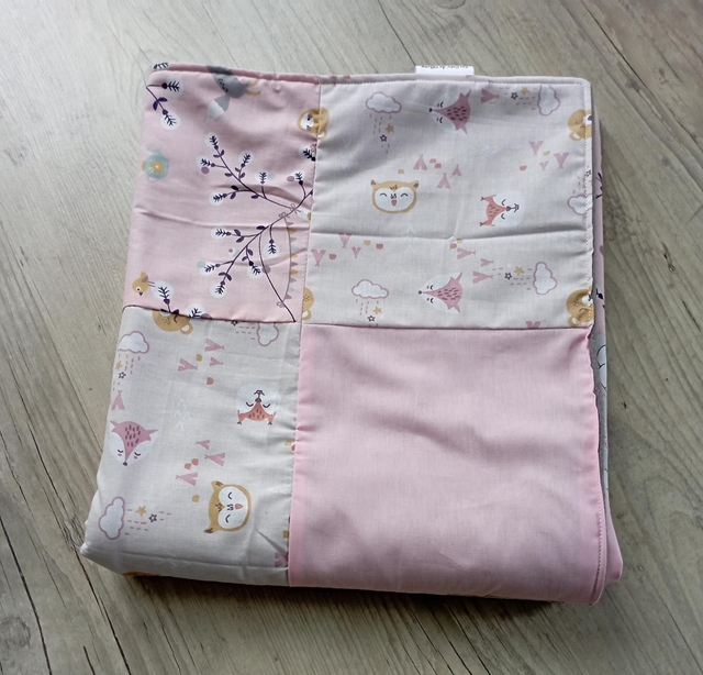 Jolie couverture patchwork en tissu coton et tissu polaire. Dimensions 68 x 85 cm.
